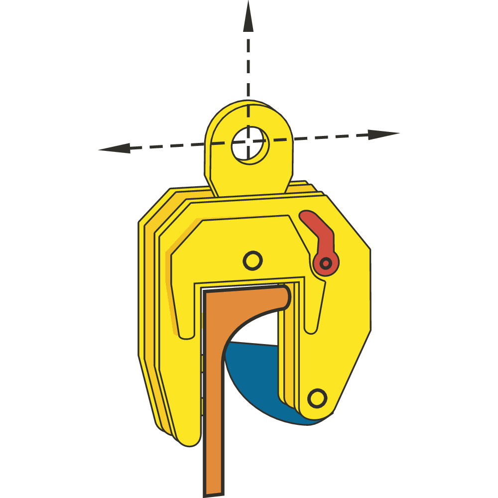 Clamp for vertical lifting, handling and transporting of Holland Profile (HP) shipbuilding structures, steel plates and structures. Also useful as a “big-jaw” opening clamp. Lifting of longer sections should be done with a spreader beam.