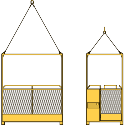 Utförande: Svetsad rörbalkskonstruktion med dränerad botten av tårplåt. Sidor av perforerad plåt. Invändigt försedd med handledare runt om. Separata fästen för fallskyddsutrustning. På ena kortsidan finns en grind, se respektive modell. Indragna fotstöd för undvikande av klämrisk. Korgen levereras komplett med 4-partig stållineredskap.